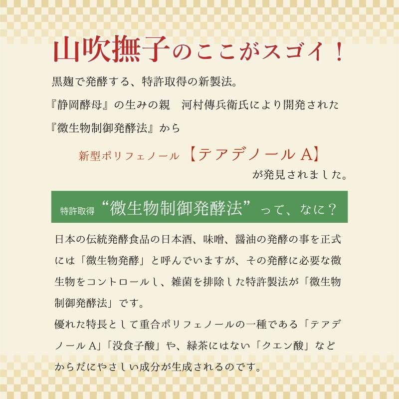 有機・黒麹発酵茶「山吹撫子」は、浜松市天竜区春野町の農薬・化学肥料不使用の有機茶を100%使用し、日本伝統のお酒造りの発酵技術を活用し、清潔で安心であることに徹底してこだわり抜いた新しい日本生まれの新製法「微生物制御発酵法」でつくられています。原料は有機のチャだけ、安心、おいしく、健康的な日本生まれの日本のお茶です。