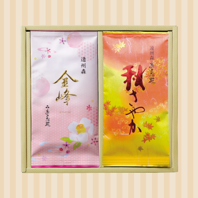 【セット内容】※本商品は箱代を含めた金額となります。上級煎茶「金峰」とコクが深くさわやかでふくよかな風味の「秋さやか」がセットになったお渡ししやすいギフトセットです。