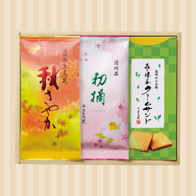 【セット内容】※本商品は箱代を含めた金額となります。コクが深くさわやかでふくよかな風味の「秋さやか」と人気の深蒸し煎茶「初摘」、人気のお菓子「クリームサンド」がセットになったお渡ししやすいギフトセットです。