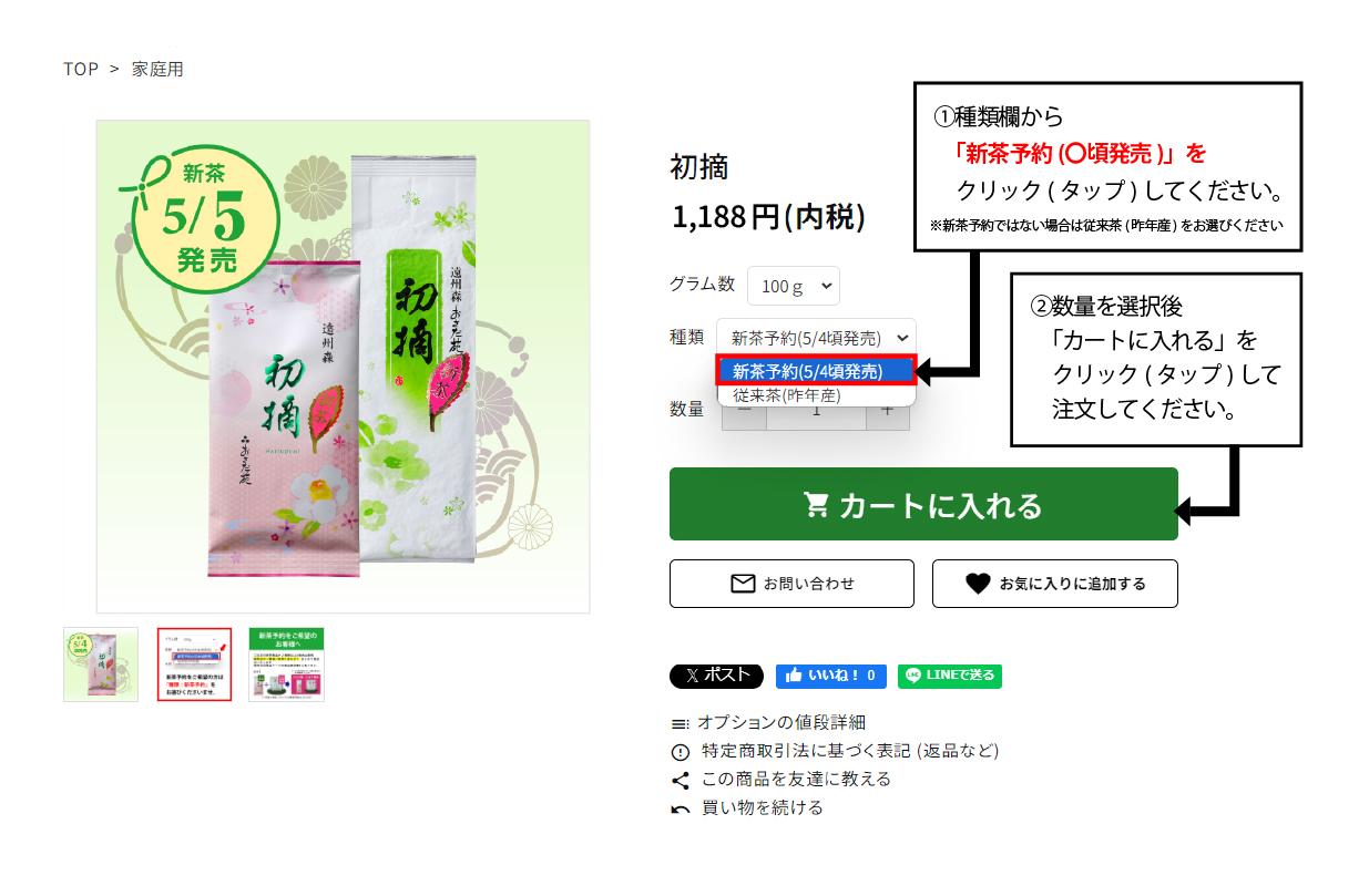 商品ページの種類欄にて「新茶予約(〇頃発売)」が選択されている状態にします。