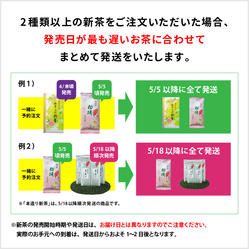 発売時期により、新茶とまとめてお届け(または新茶に切り替えてご用意)する場合がございます。