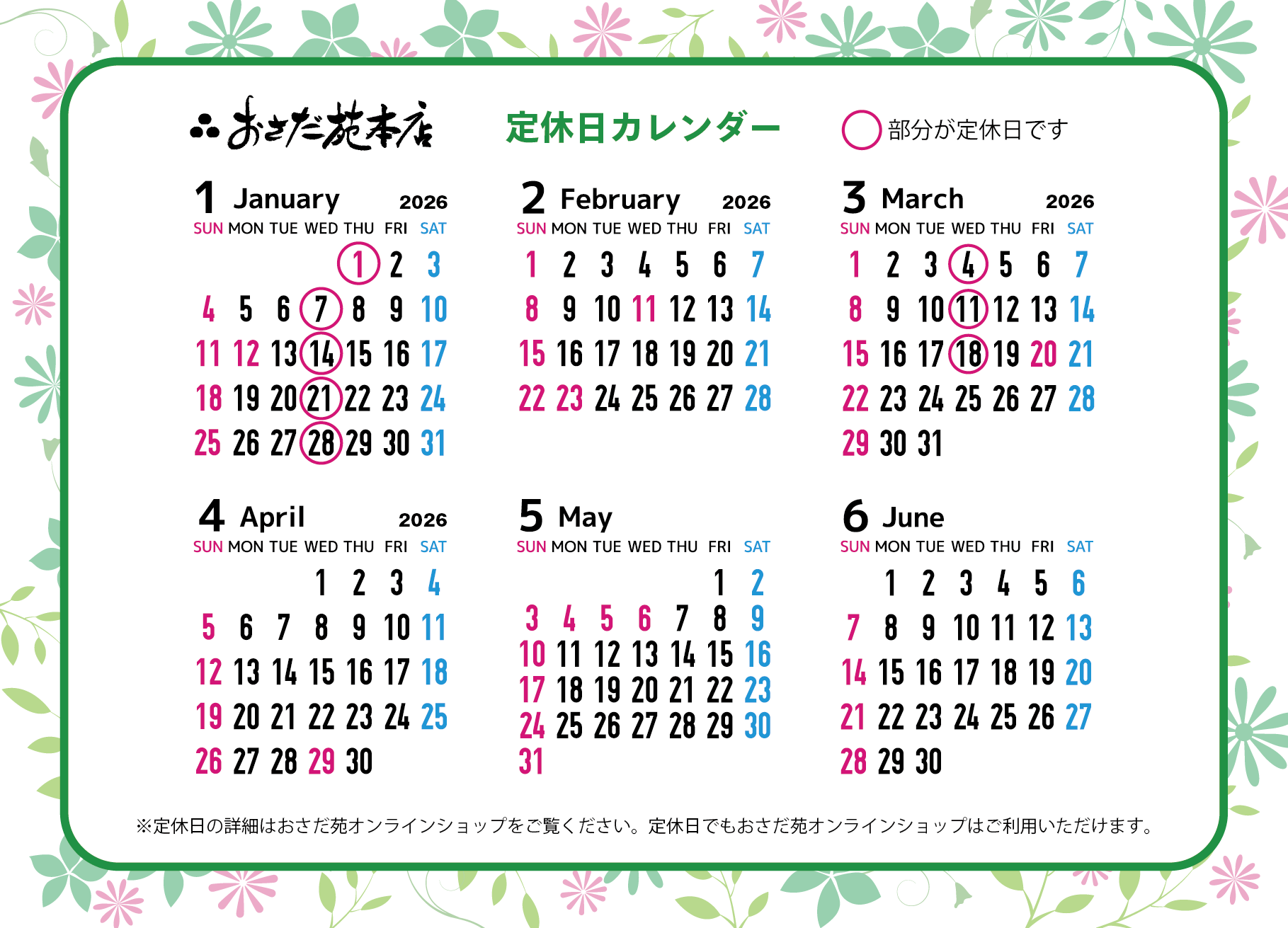 【重要】定休日に関するお知らせ 2025.09.26 お知らせ 2026年2月27日 平素よりご愛顧いただき、誠にありがとうございます。 このたび当店では、従業員の働きやすい環境づくりの一環として、一部期間に限り水曜日を定休日とさせていただきます。※祝日の水曜日は営業いたします。なお、2026年4月~9月までは定休日なしで営業いたします。今回の取り組みにより、スタッフが十分にリフレッシュし、これまで以上により良い商品とサービスをご提供できるよう努めてまいります。お客様にはご不便をおかけする場合もございますが、何卒ご理解賜りますようお願い申し上げます。今後とも変わらぬご愛顧のほど、よろしくお願い申し上げます。 ↑クリックで拡大ができます おさだ苑本店 通信販売部