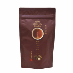 塩カシューナッツにほうじ茶を混ぜ込んで、ミルクチョコレートでコーティングしました。大人も子どもも楽しめるチョコレート菓子です。